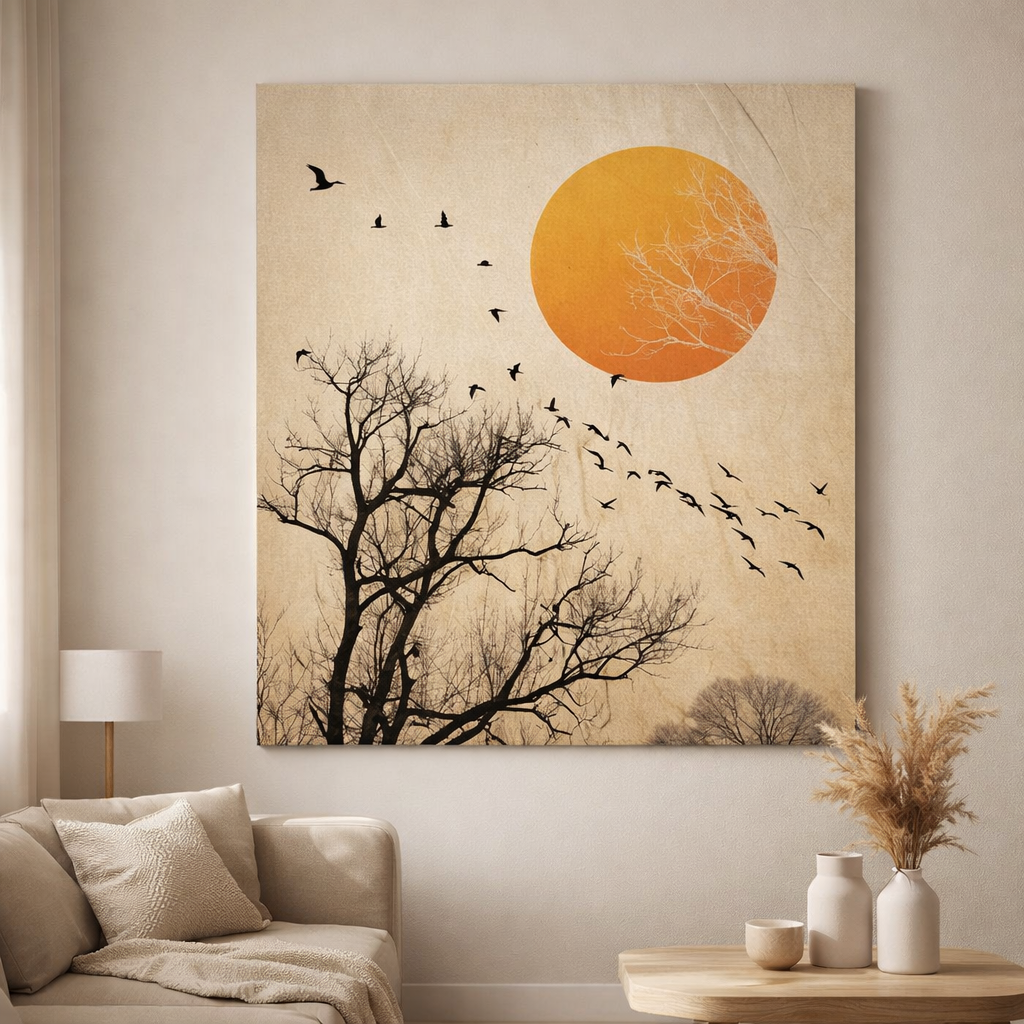 A calming minimalist canvas featuring a golden sun, bare trees, and flying birds. Warm neutral tones create a peaceful, elegant atmosphere perfect for modern and cozy interiors.