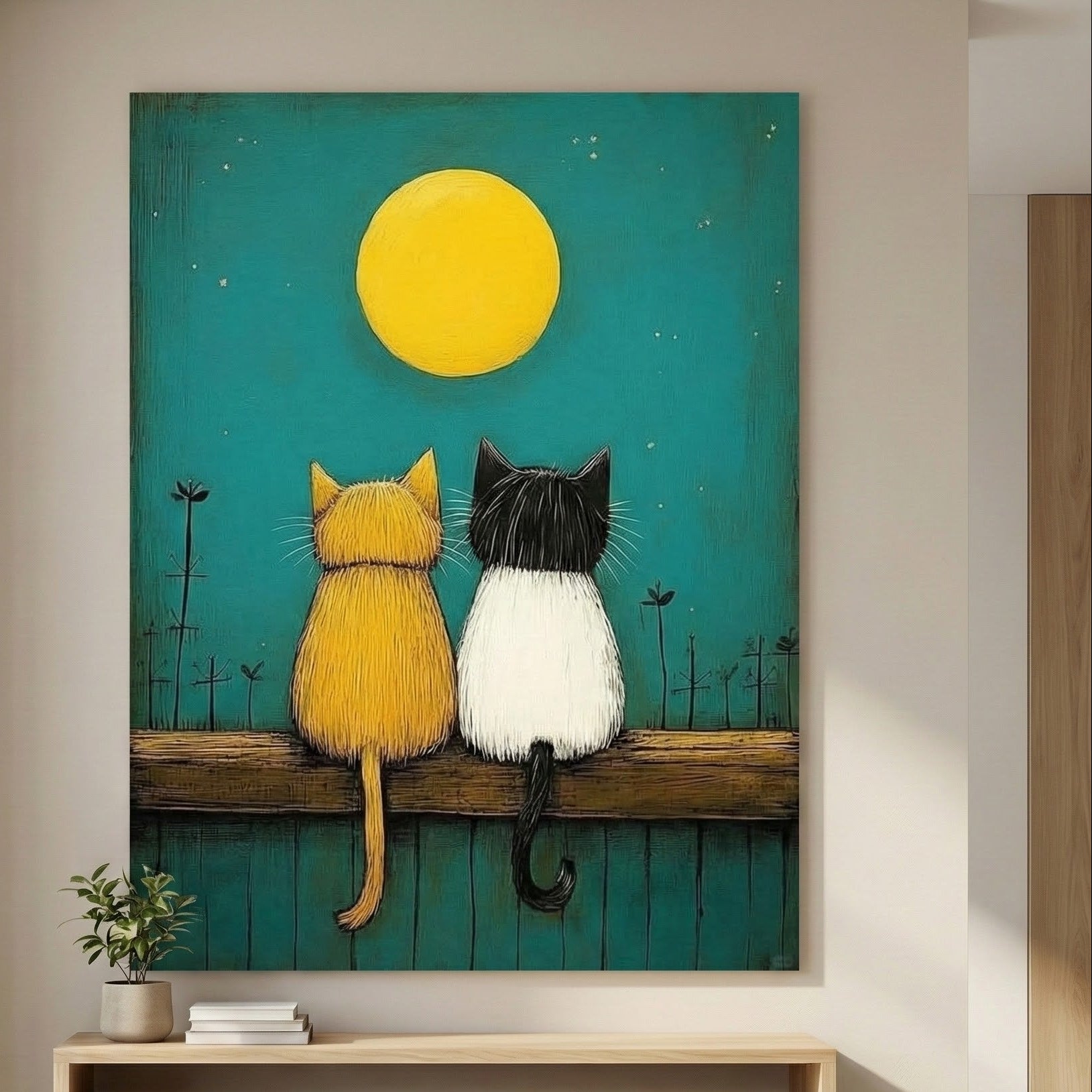 A whimsical illustrated canvas featuring two cats sitting side by side, gazing at a glowing moon against a calm teal night sky. Printed on premium-quality canvas with rich textures and soft contrasts, perfect for living rooms, bedrooms, or cozy corners.