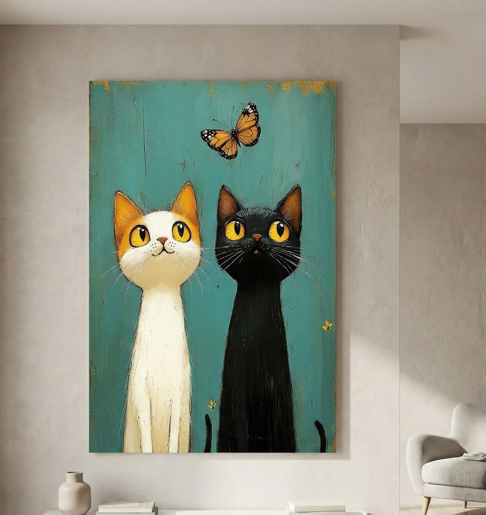 A playful illustrated canvas featuring two curious cats gazing at a delicate butterfly against a textured teal background. Printed on premium-quality canvas with expressive details and warm contrasts, perfect for living rooms, bedrooms, or pet lovers’ spaces.
