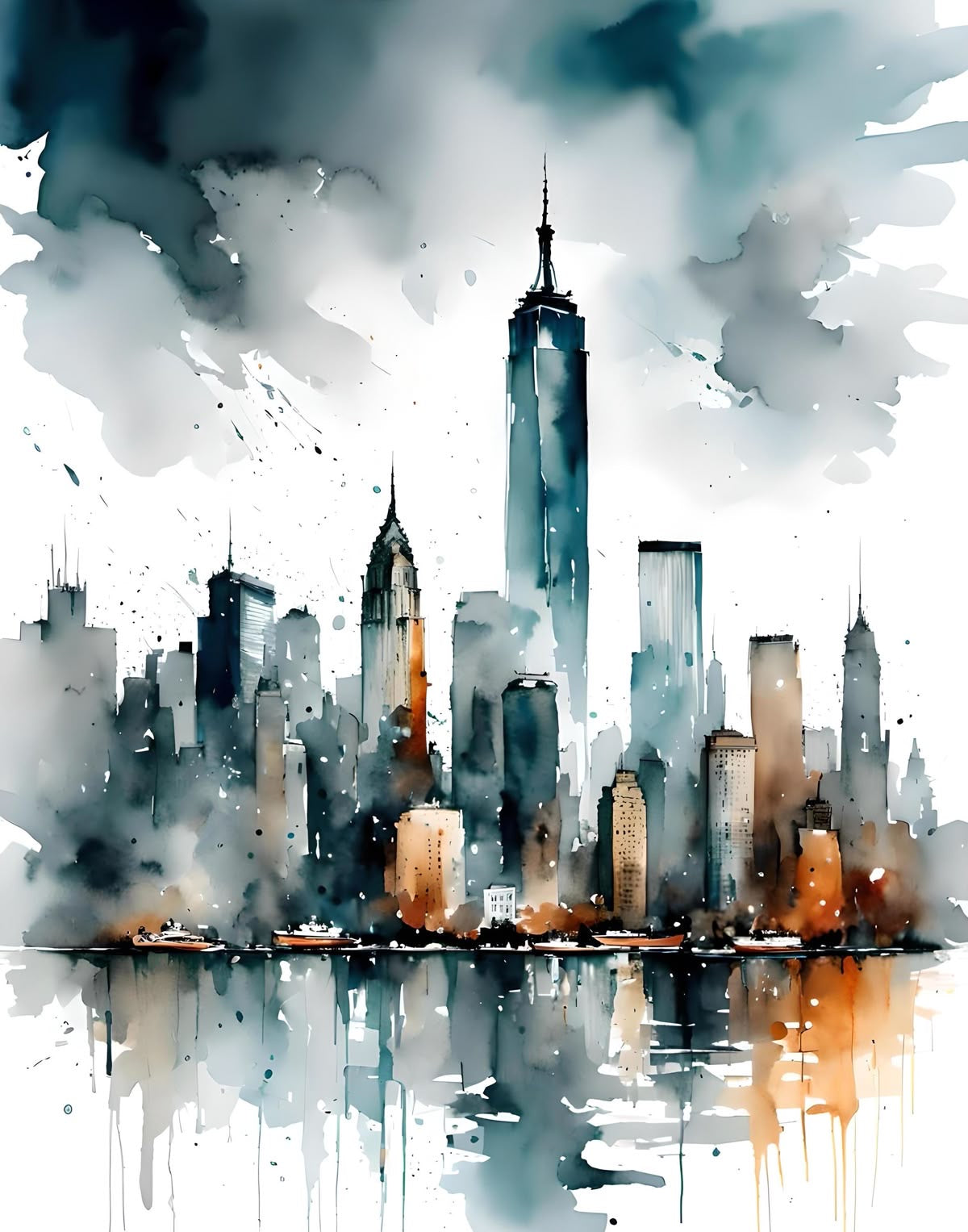 Modern abstract skyline artwork printed on premium canvas, featuring a dramatic cityscape with watercolor textures and reflective elements. Muted greys with warm highlights create a sophisticated statement piece for living rooms, offices, or contemporary interiors.