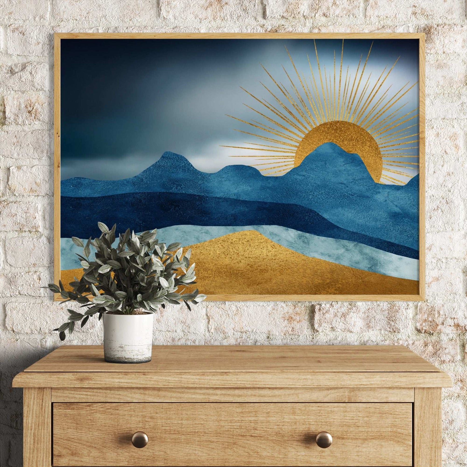 Stunning abstract landscape wall art featuring layered blue mountains with a radiant golden sun, creating a calm yet striking modern aesthetic.
