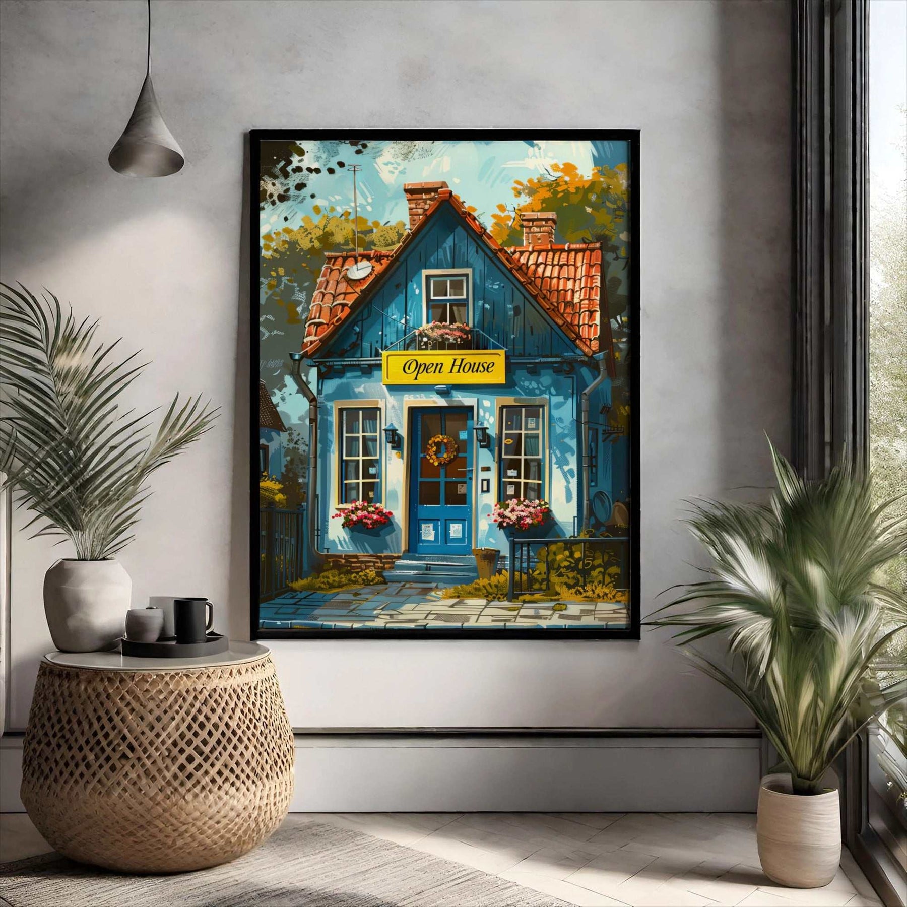 Add warmth and charm to your space with this delightful wall art featuring a cozy blue cottage with a welcoming 'Open House' sign. The vibrant colors and inviting details create a cheerful, homely atmosphere perfect for modern and rustic interiors.