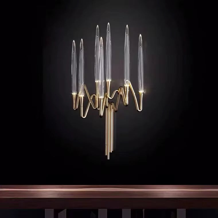Elevate your walls with the Crystal Wave Wall Light. Its sleek crystal-like lights and golden wave frame create a luxurious and artistic accent, perfect for hallways, bedrooms, or living rooms.