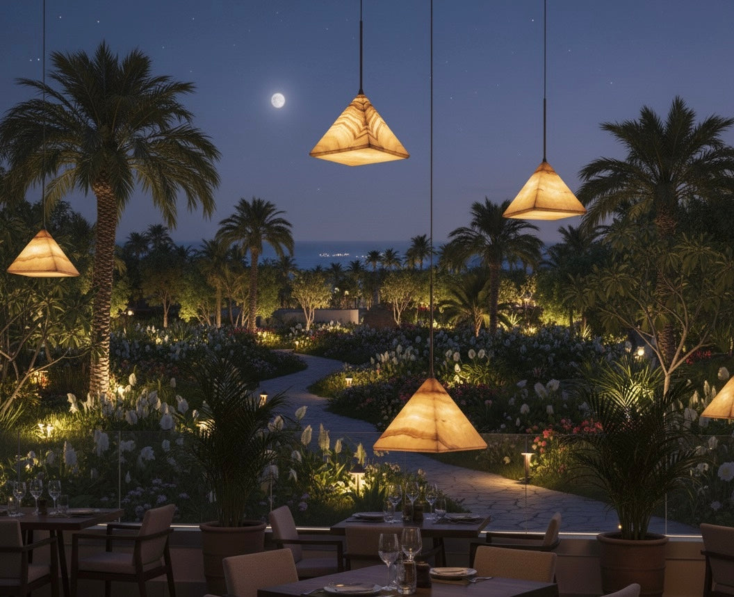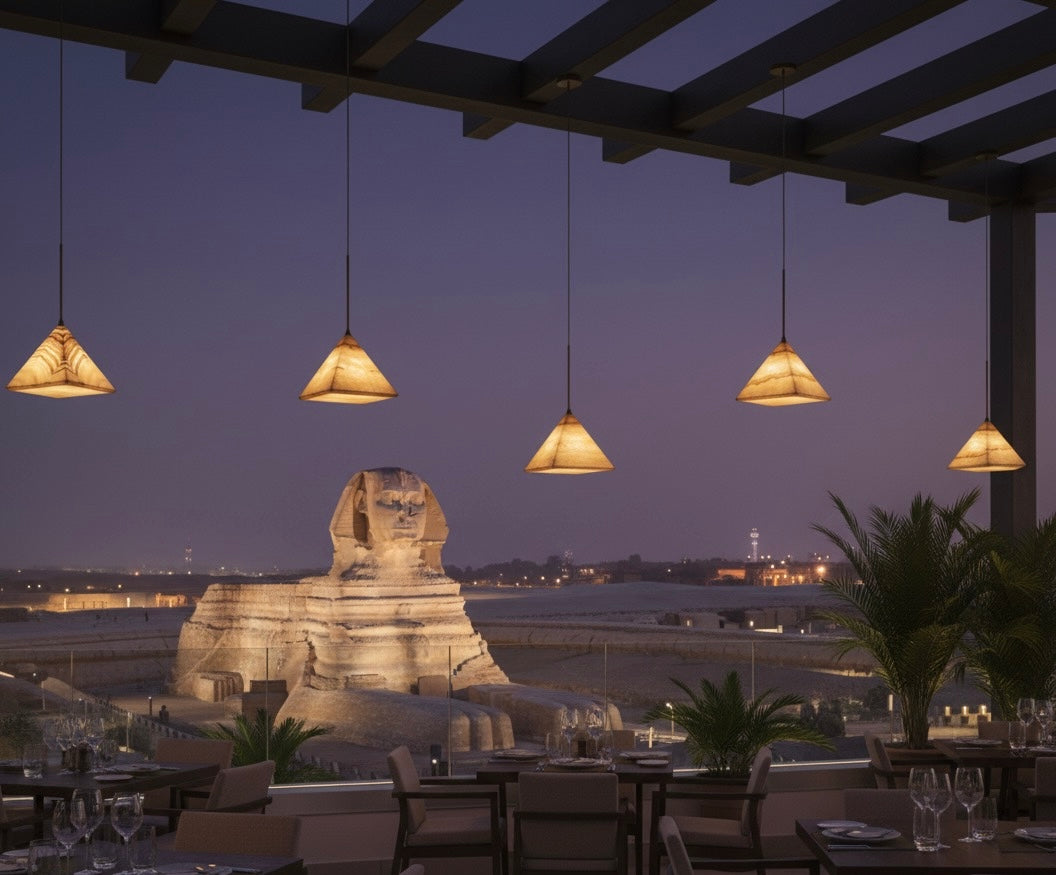 A warm, pyramid-shaped pendant light featuring a stone-like texture, perfect for creating an intimate, atmospheric glow in any interior.