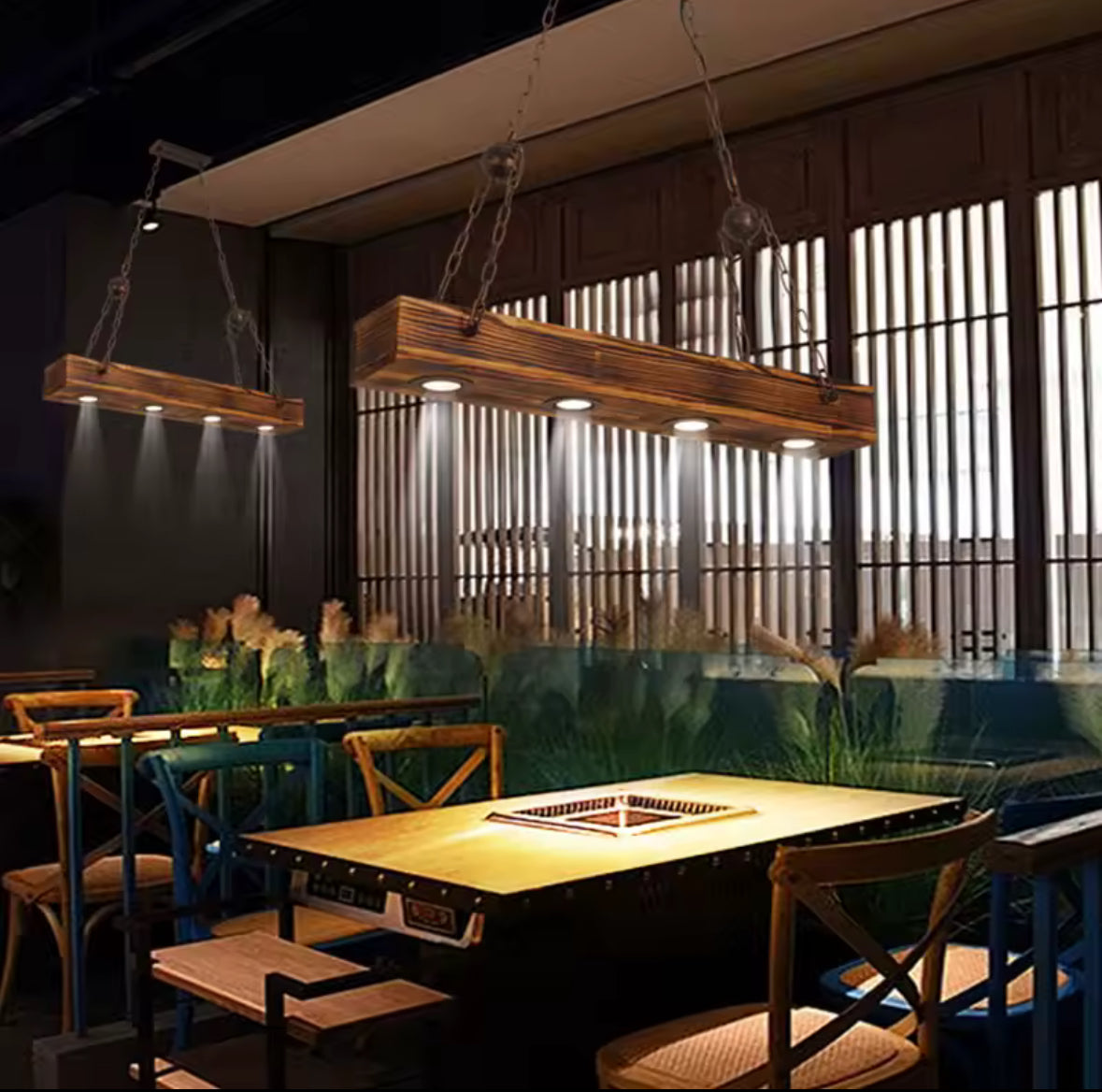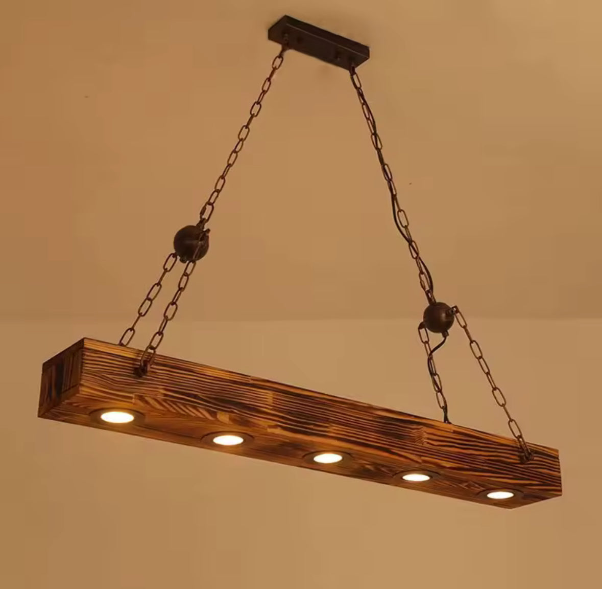 A handcrafted rustic wooden pendant light with warm built-in LEDs and industrial chain suspension — perfect for adding atmosphere to dining or kitchen spaces.