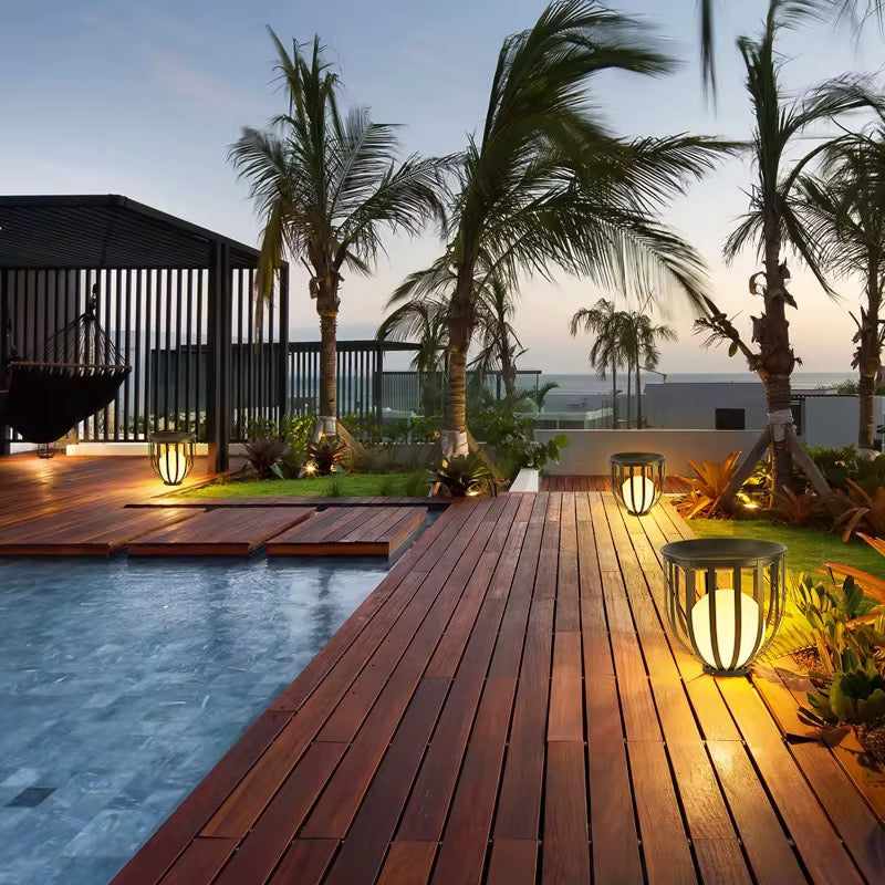 A modern lantern-style outdoor light offering soft ambient garden illumination.