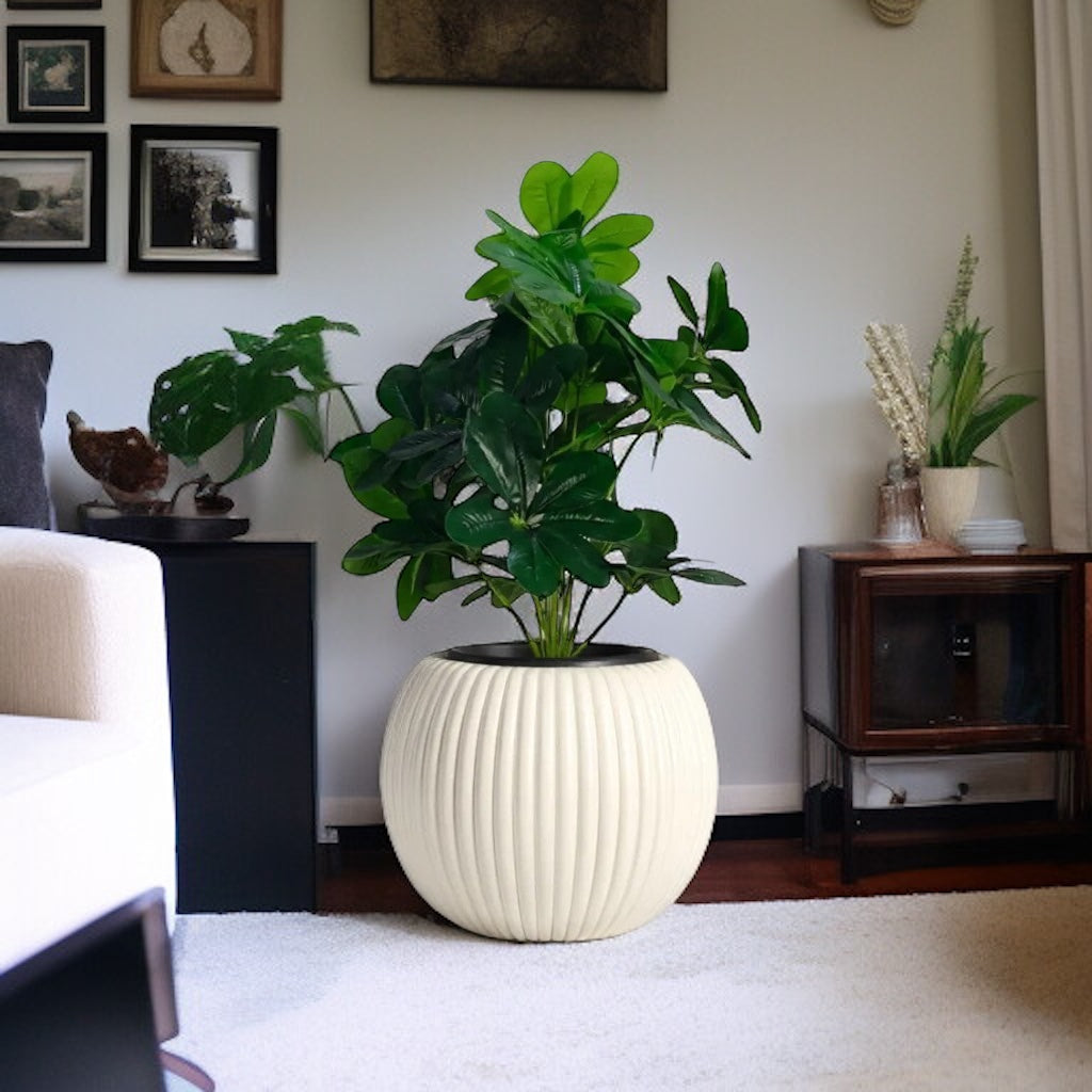Enhance your living space with this realistic artificial rubber plant, presented in a ribbed white ceramic pot and topped with decorative pebbles. A perfect maintenance-free addition for modern interiors, this piece brings a touch of greenery and elegance to any room. Ideal for placement beside consoles, TV units, or shelving areas.
