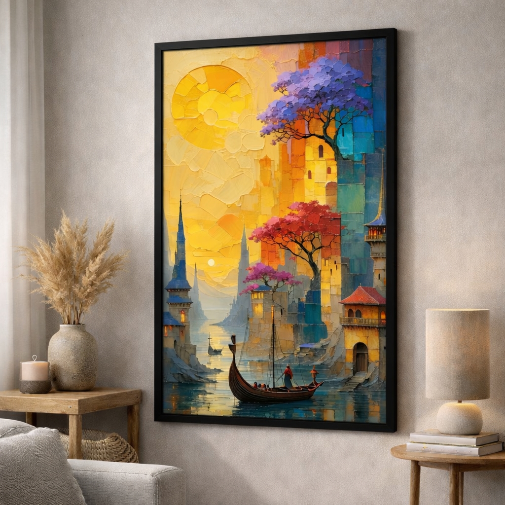A richly textured Framed artwork depicting a dreamy cityscape with warm golden skies, vibrant architecture, and a peaceful boat gliding through reflective waters. A captivating statement piece that adds color, depth, and artistic elegance to modern interiors.