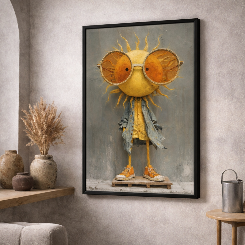 A quirky artistic Framed featuring a playful sun-inspired character wearing oversized glasses and casual attire. A unique statement piece that adds creativity, warmth, and modern character to contemporary living spaces.