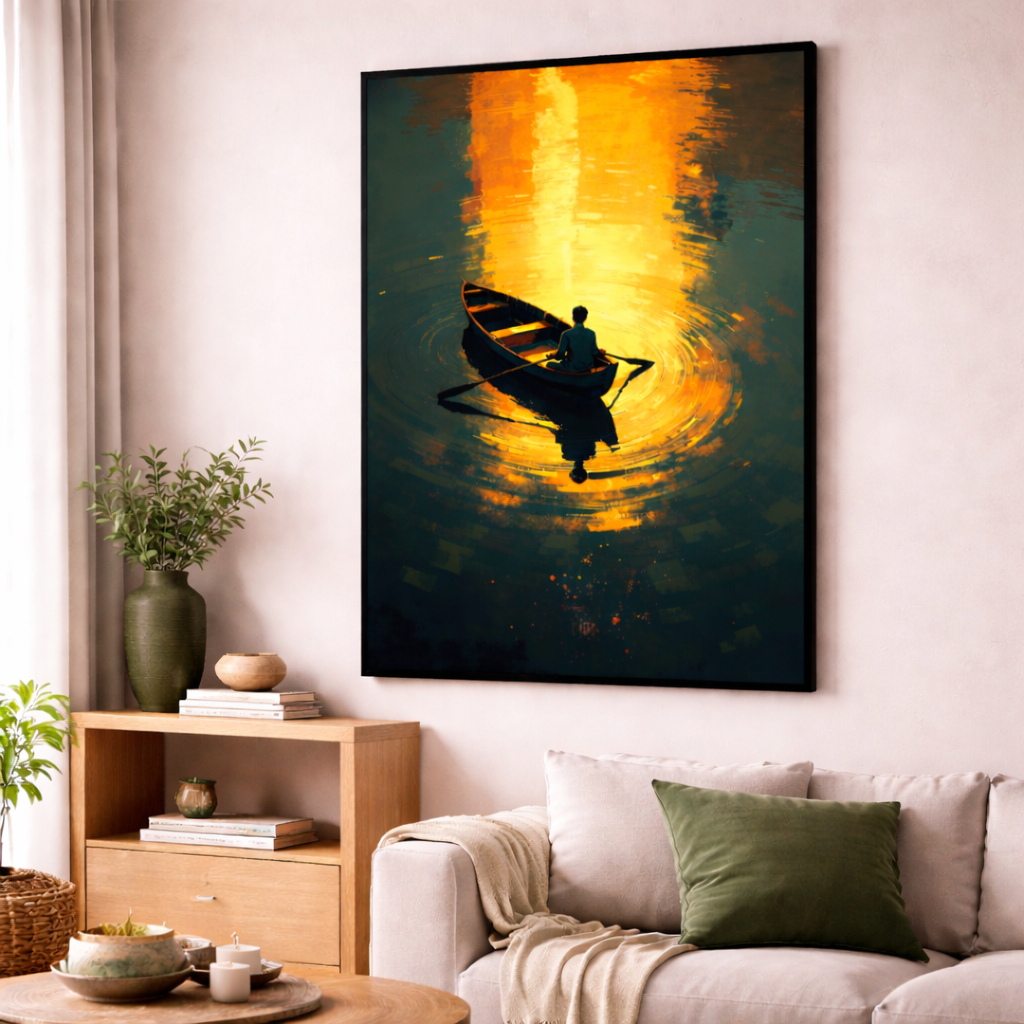 An atmospheric Framed artwork depicting a lone rower drifting across calm waters illuminated by golden reflections. A powerful, emotional piece that brings depth, calm, and sophistication to modern interiors.
