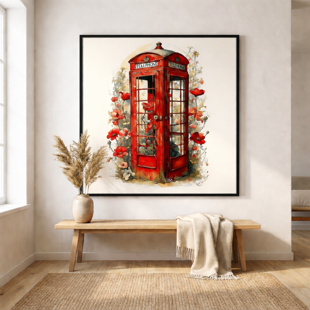 Elegant watercolor-style artwork printed on premium Framed, featuring an iconic red telephone booth surrounded by delicate floral details. The blend of bold red tones and soft botanical elements adds charm and character to modern, classic, or cozy interiors.