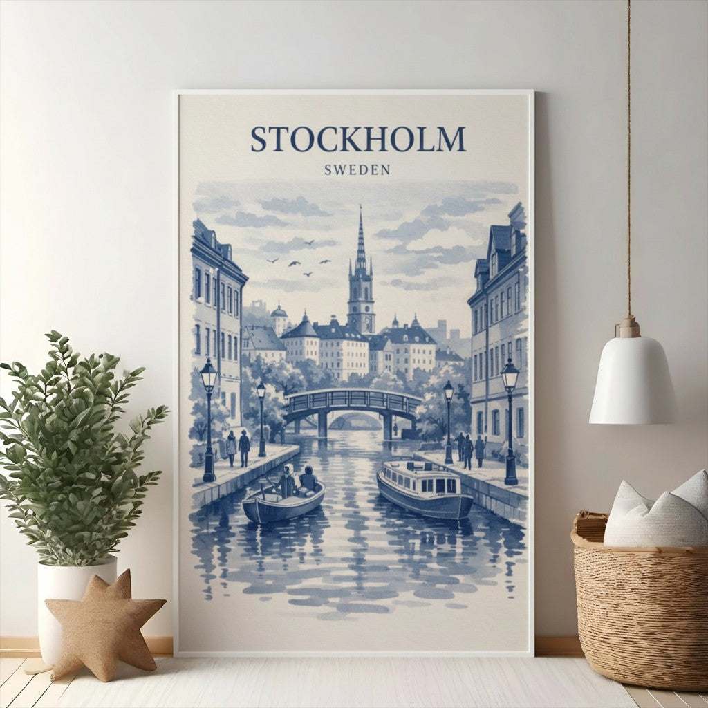 Bring the charm of the Swedish capital into your home with this beautiful Stockholm canal print. Featuring a serene blue and white watercolor design, this artwork captures the picturesque waterways, historic architecture, and charming bridges that define Stockholm. Perfect for adding a touch of European elegance to any room, this print serves as a constant reminder of a tranquil canal-side escape. Ideal for travel enthusiasts and lovers of Scandinavian design, this piece will transport you to the heart of Sweden with its timeless appeal.