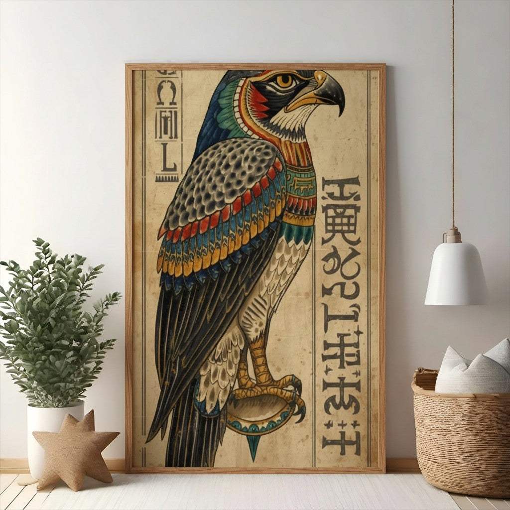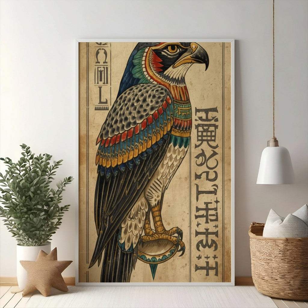 Bring the majesty of ancient Egypt into your home with this striking Falcon Hieroglyphic Wall Art. This captivating piece features a beautifully rendered falcon, a symbol of power and divinity, adorned with vibrant colors and intricate details. Flanked by authentic hieroglyphic script on a textured, aged background, this artwork evokes a sense of history and mystery. Perfect for adding a touch of exotic elegance and timeless allure to any living space, study, or office. Elevate your decor with this unique statement piece that celebrates ancient Egyptian culture and artistry.