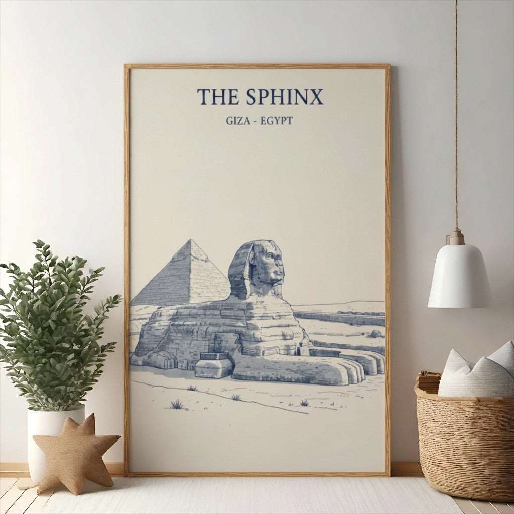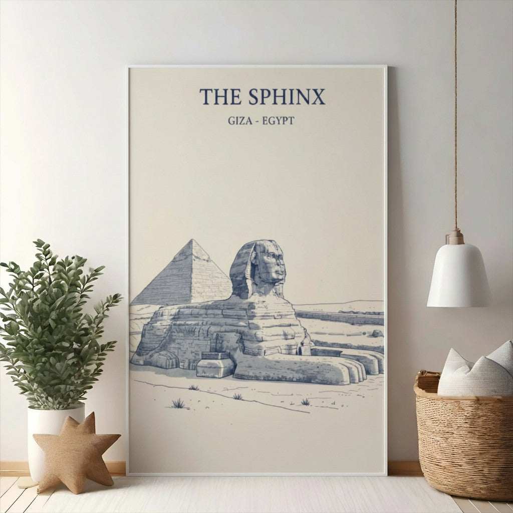 Bring the majesty of ancient Egypt into your home with this striking "The Sphinx Giza Egypt" poster. Featuring a detailed, minimalist line drawing of the iconic Sphinx and pyramids, this artwork captures the timeless grandeur of this historical wonder. Printed on high-quality material, this poster is perfect for adding a touch of adventure and culture to any room. Ideal for travel enthusiasts and history buffs, it serves as a beautiful reminder of one of the world's most enigmatic landmarks. Elevate your decor with this captivating piece of Egyptian art.