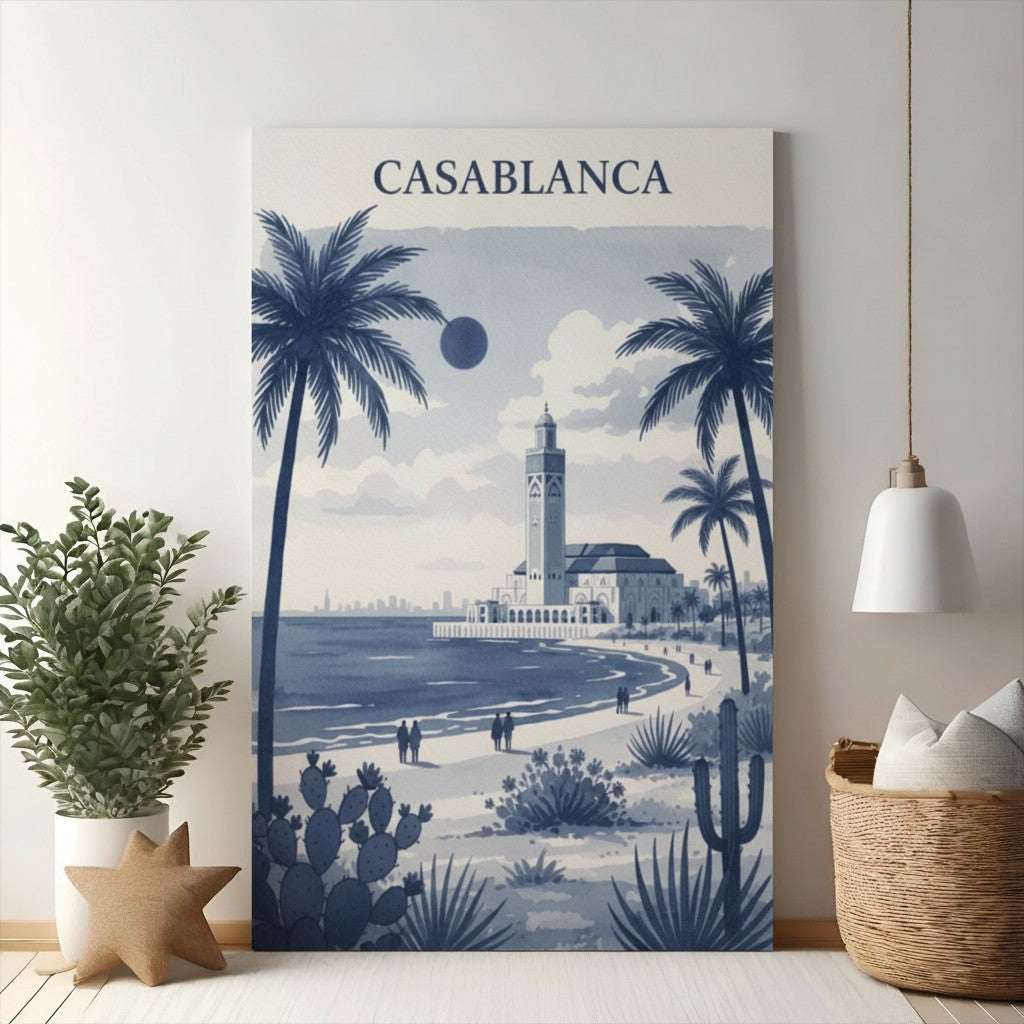 Bring the vibrant spirit of Morocco into your home with this stunning Casablanca Coastal Landscape Poster. Featuring a serene watercolor-style depiction of the iconic Hassan II Mosque against a backdrop of palm trees and a tranquil coastline, this artwork captures the essence of a peaceful day by the sea. The calming blue and white palette evokes a sense of serenity, making it a perfect addition to any living room, bedroom, or office space. This travel-inspired art print is ideal for anyone who loves coastal decor or dreams of exotic destinations. Add a touch of international flair and wanderlust to your walls with this beautiful Casablanca art.
