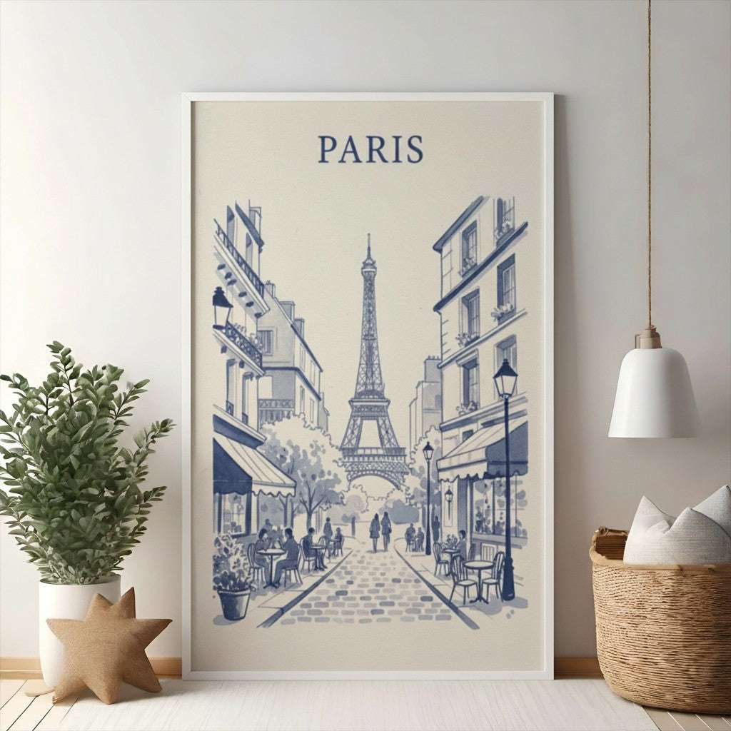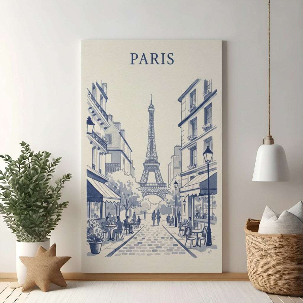 Bring the charm of Paris into your home with this exquisite "Parisian Street Scene" artwork. Featuring a classic blue and white watercolor style, this piece captures the iconic Eiffel Tower at the end of a quaint cobblestone street lined with charming cafes and Parisian architecture. It's the perfect way to add a touch of European elegance and wanderlust to any room. Ideal for living rooms, bedrooms, or as a thoughtful gift for travel enthusiasts.