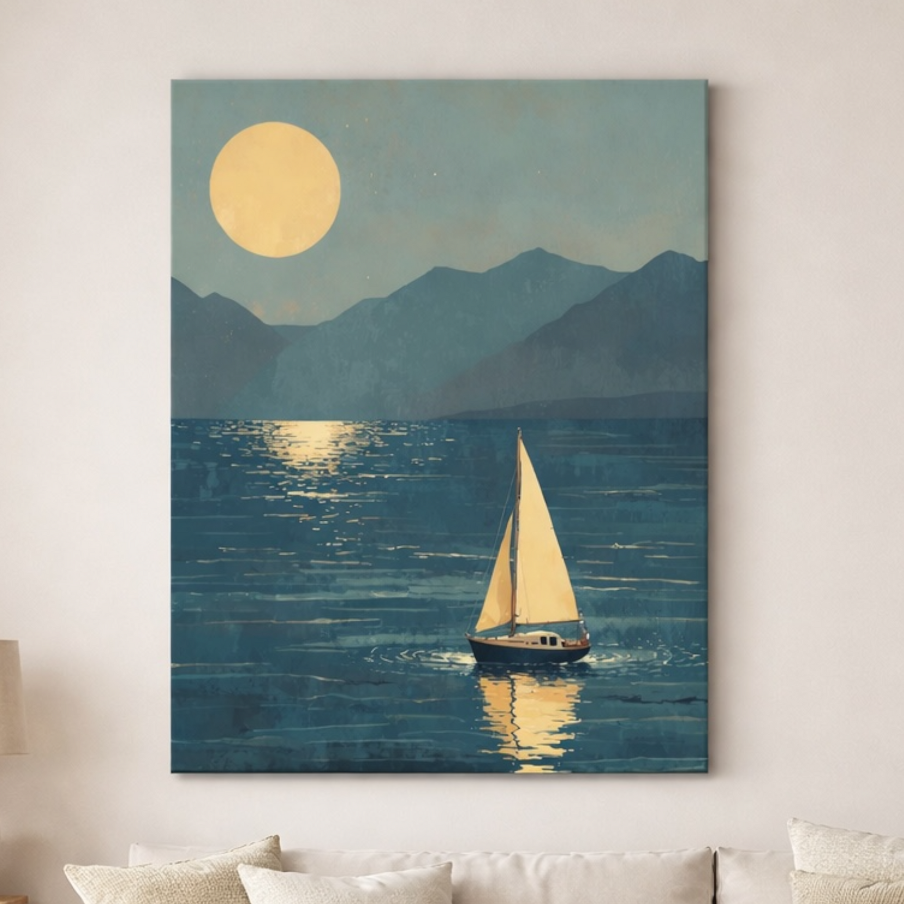 A calm sailboat gliding over tranquil waters under a glowing moon, creating a peaceful and timeless atmosphere perfect for elegant interiors.
