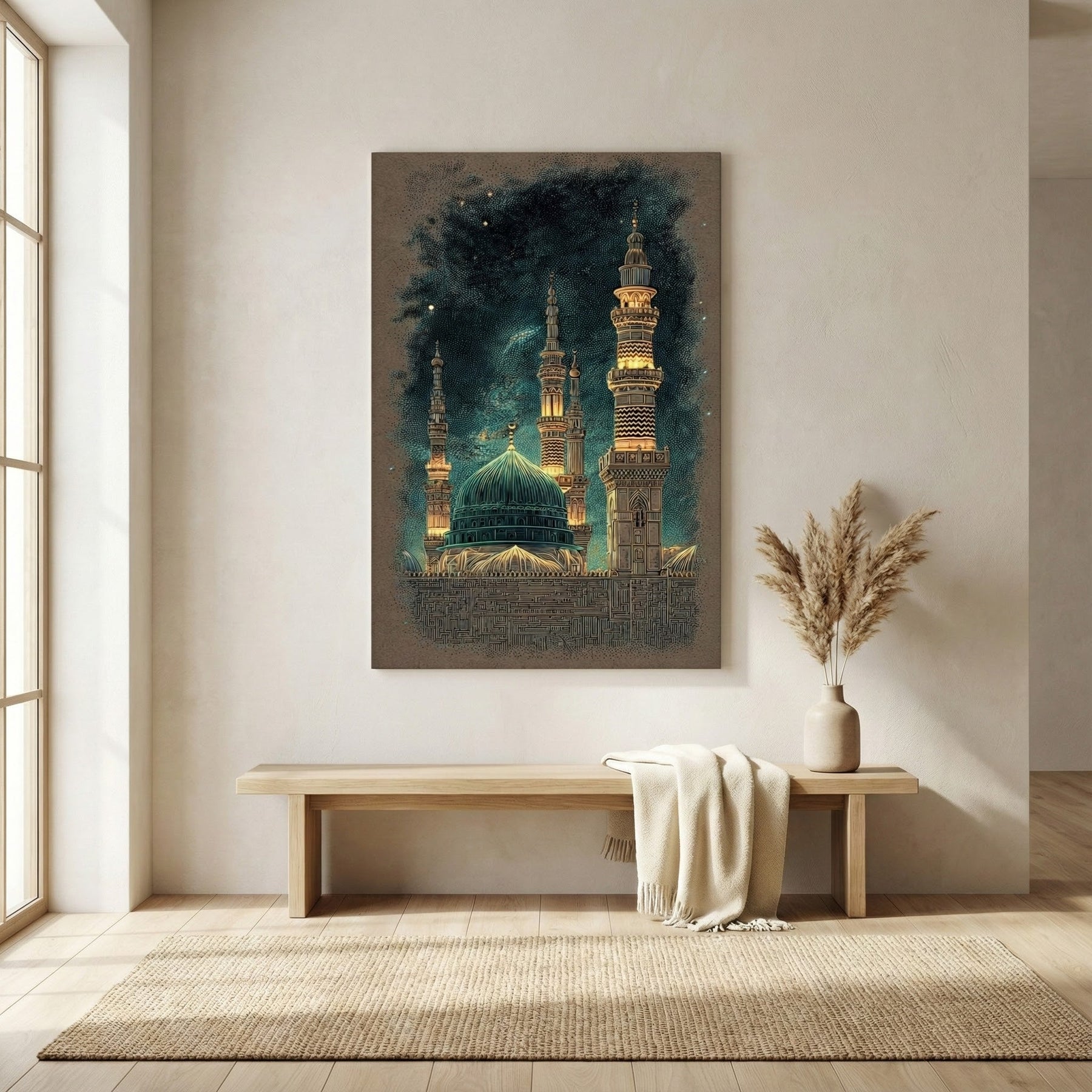 Elegant spiritual artwork printed on premium canvas, depicting Al-Masjid an-Nabawi with its iconic green dome and illuminated minarets. Deep night tones combined with golden highlights create a peaceful and reverent atmosphere, ideal for living rooms, prayer areas, or refined interiors.