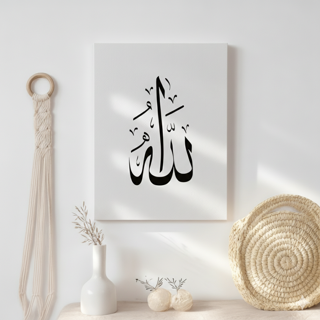 This elegant canvas features the Arabic calligraphy of the word “Allah”, presented in a minimalist black design on a clean neutral background. The artwork adds a calm, spiritual atmosphere to any space, making it perfect for living rooms, bedrooms, prayer areas, or modern interiors. Printed in high resolution with sharp detail, the canvas offers a refined gallery-style look that complements contemporary décor.