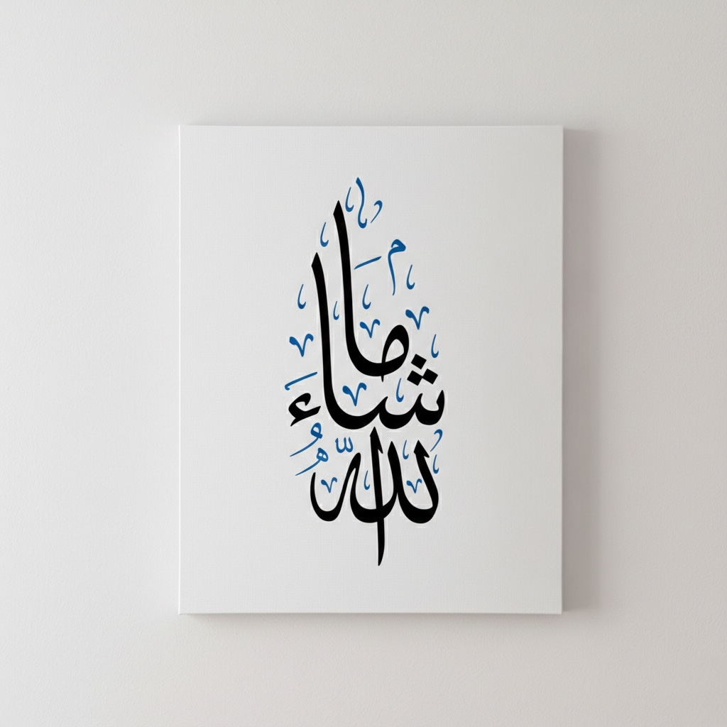 Bring a modern spiritual accent into your home with this striking Arabic calligraphy canvas featuring the word “Mashallah” in bold black script with dynamic blue accents. Printed in high resolution on premium canvas, the minimalist composition creates a clean, contemporary statement while preserving the beauty of traditional calligraphy.