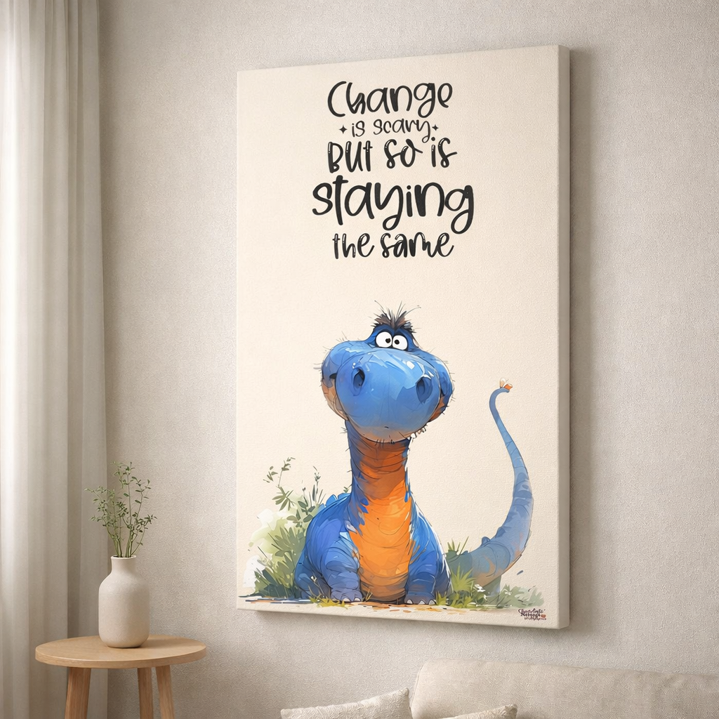 An uplifting whimsical canvas artwork featuring a friendly blue dinosaur paired with an inspirational quote about change. With playful illustration and clean typography, this frameless canvas adds motivation, positivity, and charm to modern homes, offices, and kids’ rooms.
