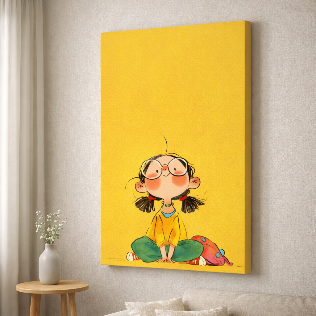 A bright and cheerful canvas artwork featuring a cute illustrated girl with glasses set against a bold yellow background. With playful charm and vibrant color, this frameless canvas brings happiness, creativity, and modern style to kids’ rooms, nurseries, and joyful interiors.