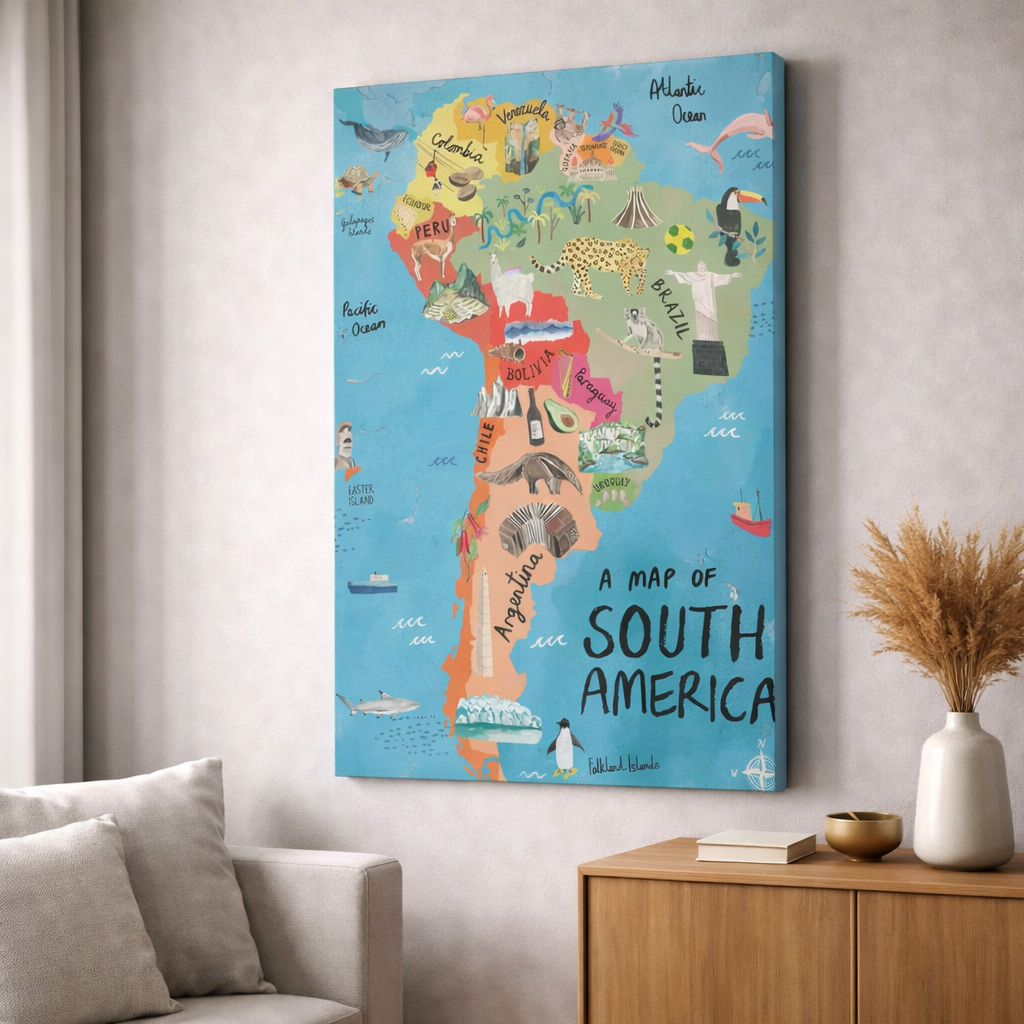 A colorful illustrated map canvas of South America showcasing countries, landmarks, wildlife, and oceans in a fun, educational style. Hand-drawn details and soft tones make it ideal for kids’ rooms, classrooms, nurseries, and learning-inspired spaces.