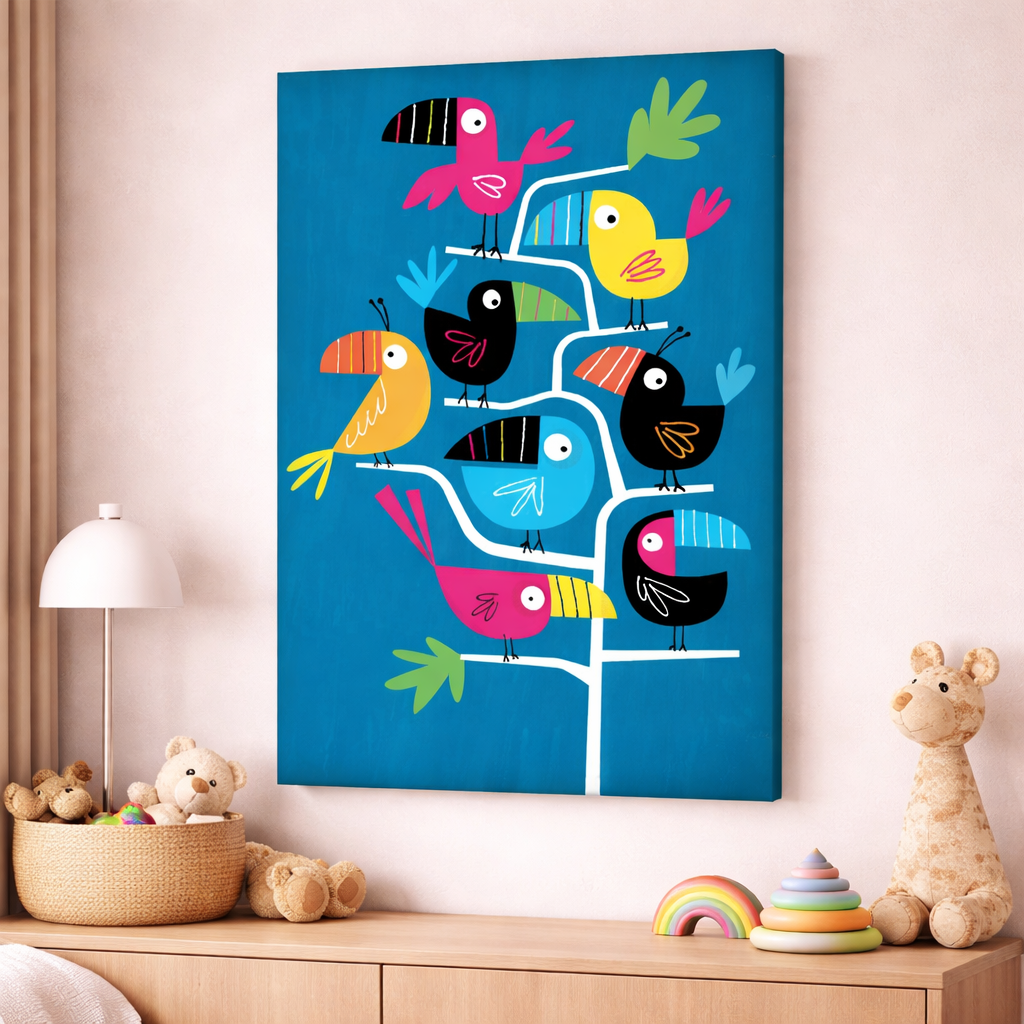 A vibrant and playful toucan birds illustration canvas that adds fun, color, and joy to kids’ rooms and nurseries.