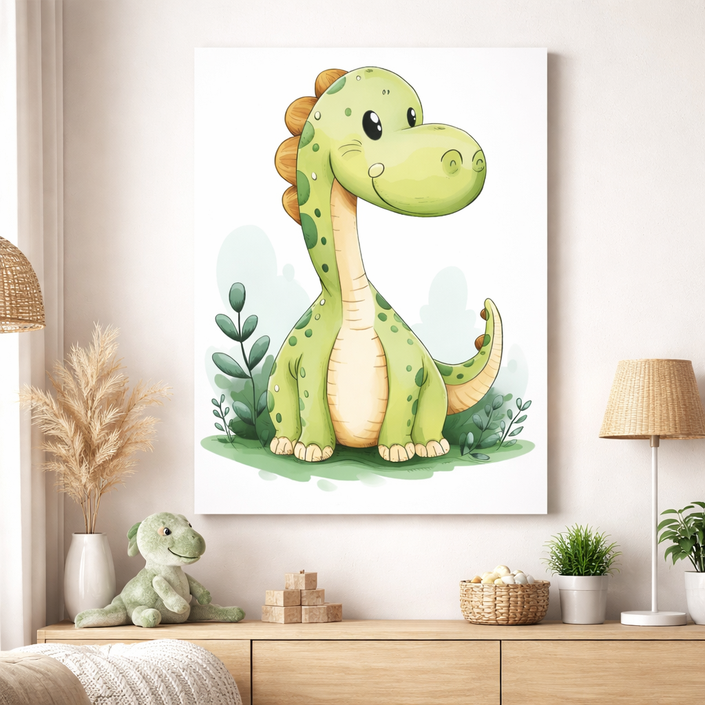 A friendly dinosaur illustration canvas with soft green tones, designed to delight kids and spark imagination.