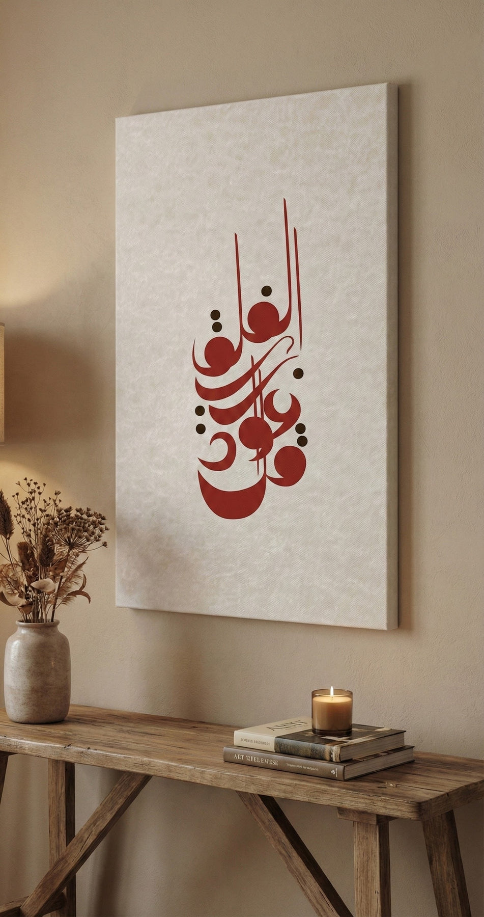 An elegant Arabic calligraphy canvas featuring a refined modern composition in deep red tones on a soft neutral background. This artwork adds spiritual depth and timeless sophistication to living rooms, hallways, or serene interior spaces.