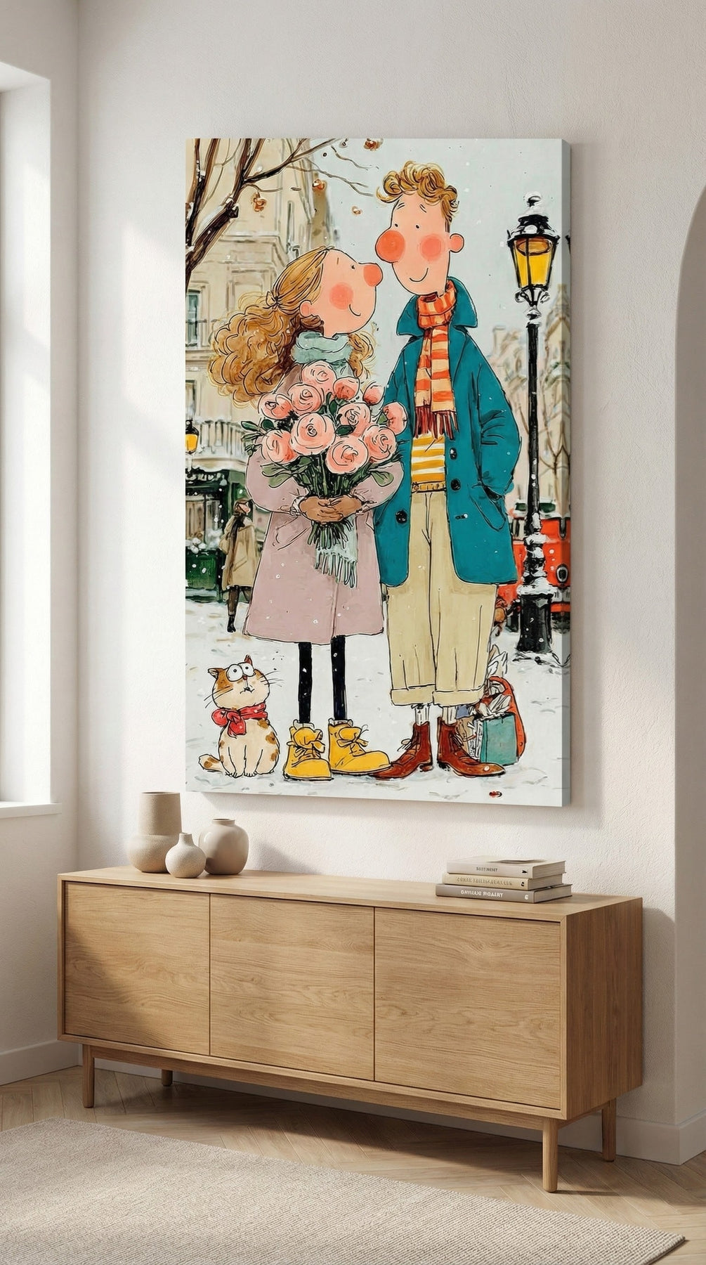 A heartwarming illustrated canvas featuring a romantic couple sharing a tender moment on a winter street, surrounded by soft snowfall and warm city lights. With gentle colors and a whimsical artistic style, this artwork adds love, warmth, and charm to living rooms, bedrooms, or cozy spaces.