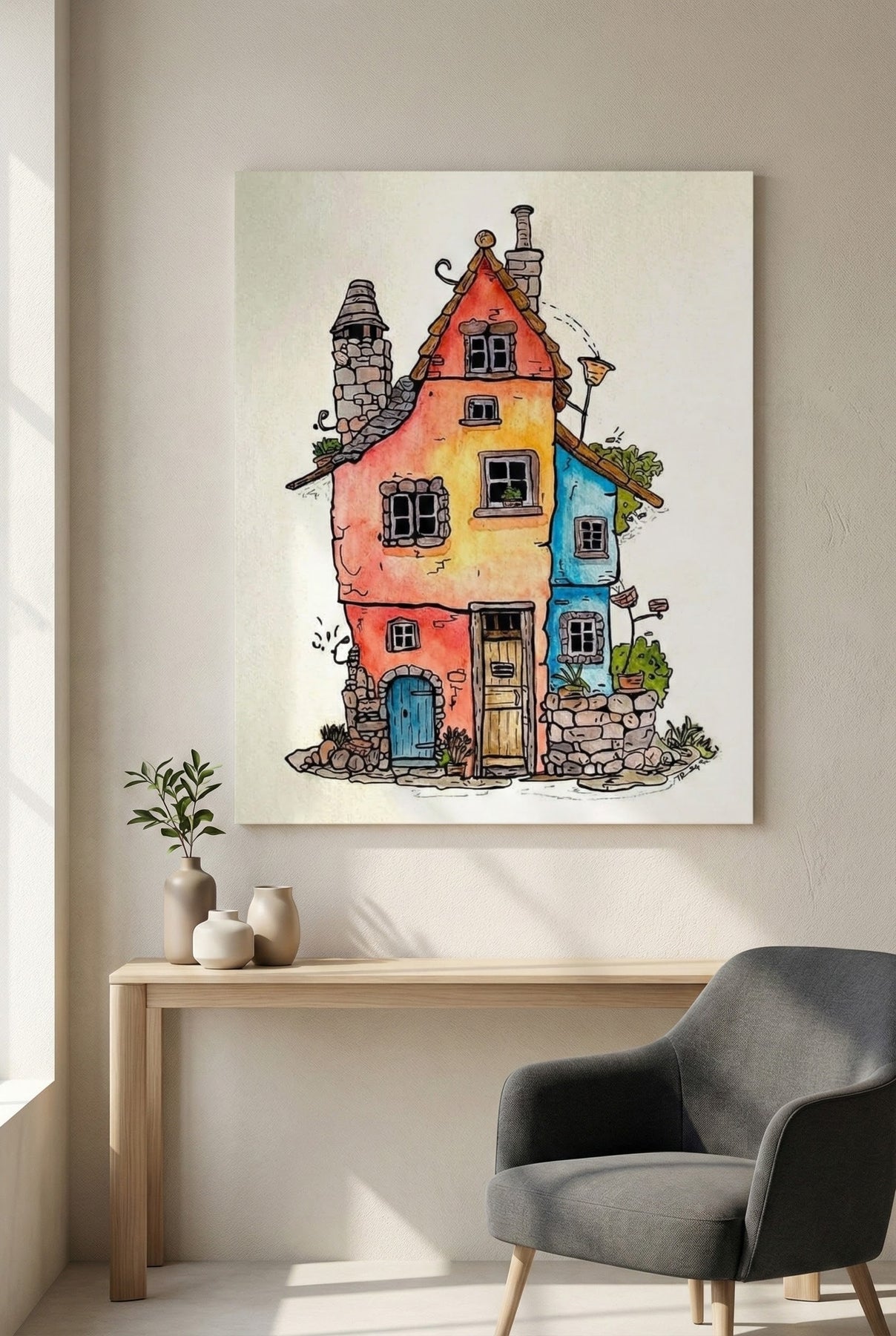Add charm and warmth to your space with this whimsical hand-drawn house canvas. Featuring soft watercolor tones and playful architectural details, it creates a cozy, artistic atmosphere perfect for living rooms, bedrooms, or creative corners.