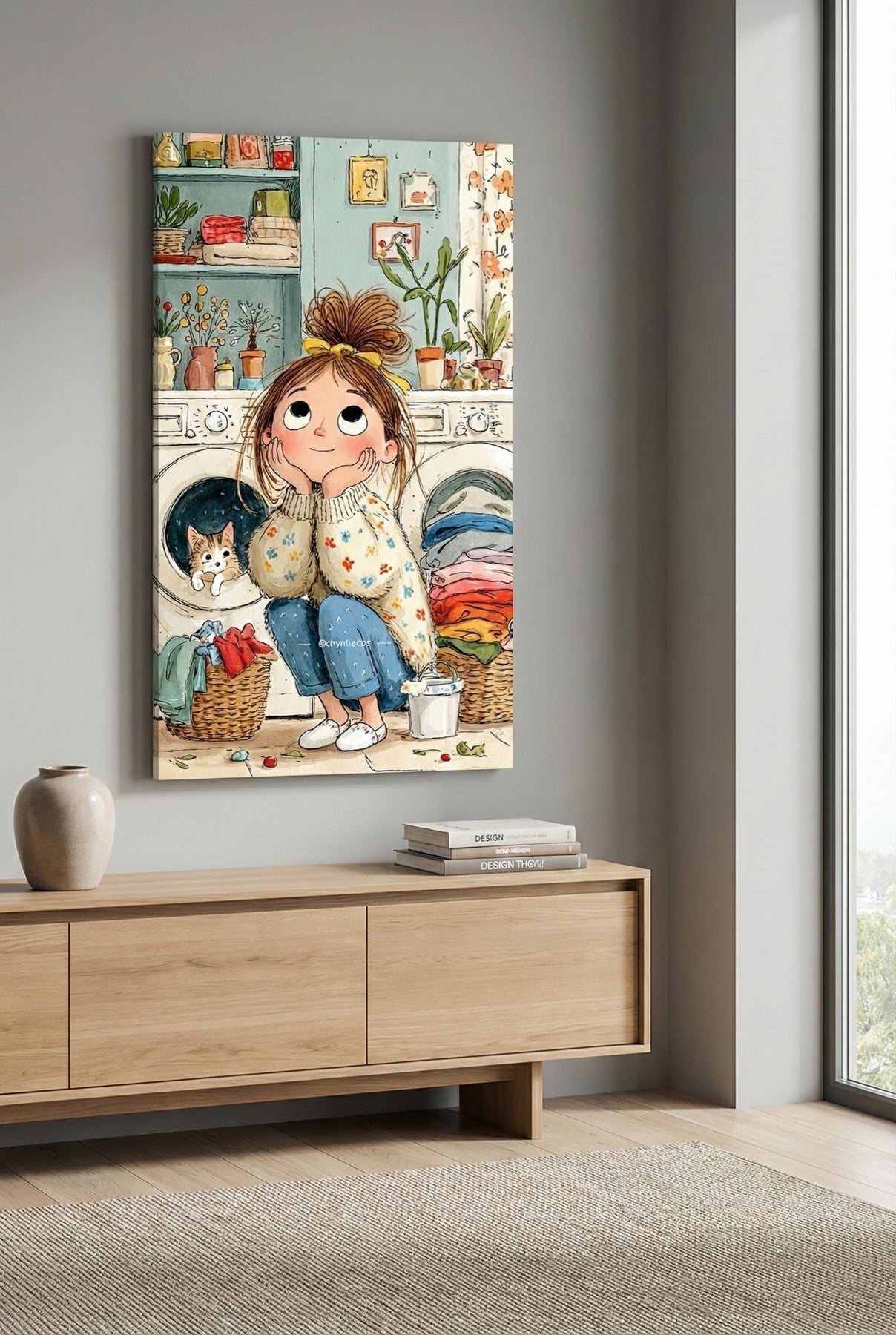 Bring a smile and cozy charm to your space with this whimsical laundry day canvas. Featuring a sweet illustrated girl enjoying a quiet moment in a colorful laundry room, this artwork adds warmth, relatability, and playful character to family spaces, bedrooms, or casual living areas.