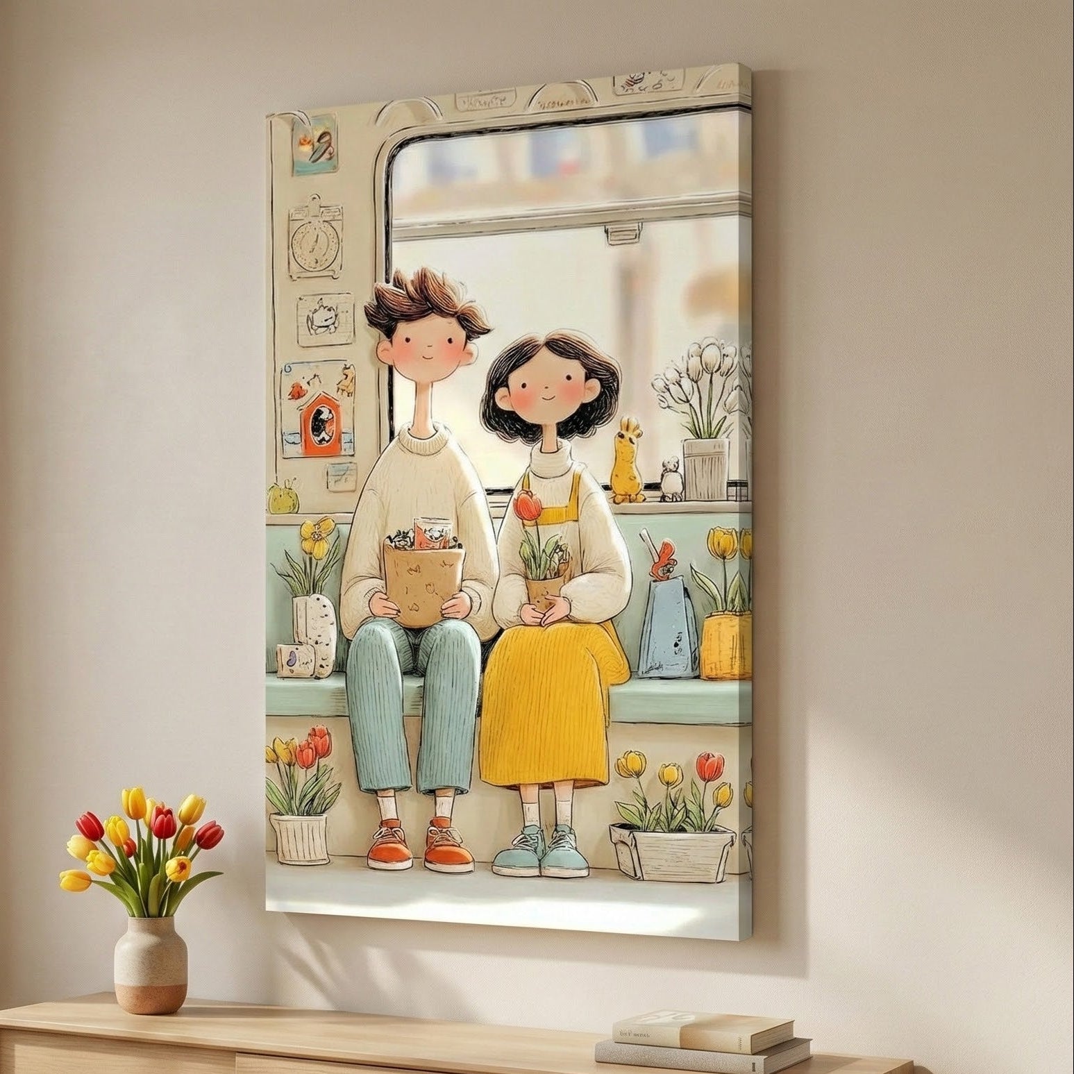 A charming illustrated canvas featuring a cozy couple sitting together by a window, surrounded by soft florals and warm pastel tones. Printed on premium-quality canvas with delicate details and a gentle, comforting mood, ideal for living rooms, bedrooms, or reading corners.