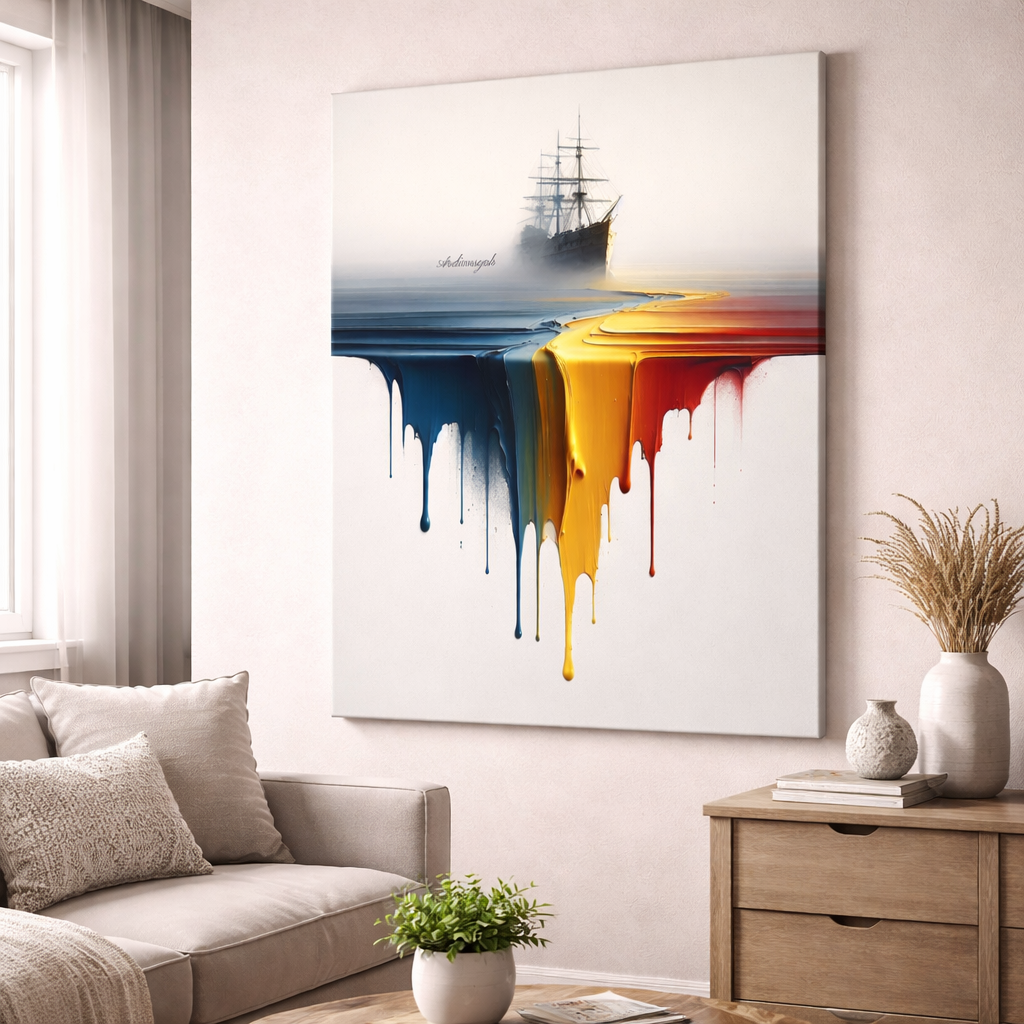 A striking abstract canvas artwork featuring a distant ship above a flowing horizon of melted colors. This modern piece blends calm maritime elements with bold artistic expression, making it a refined statement for contemporary living spaces.