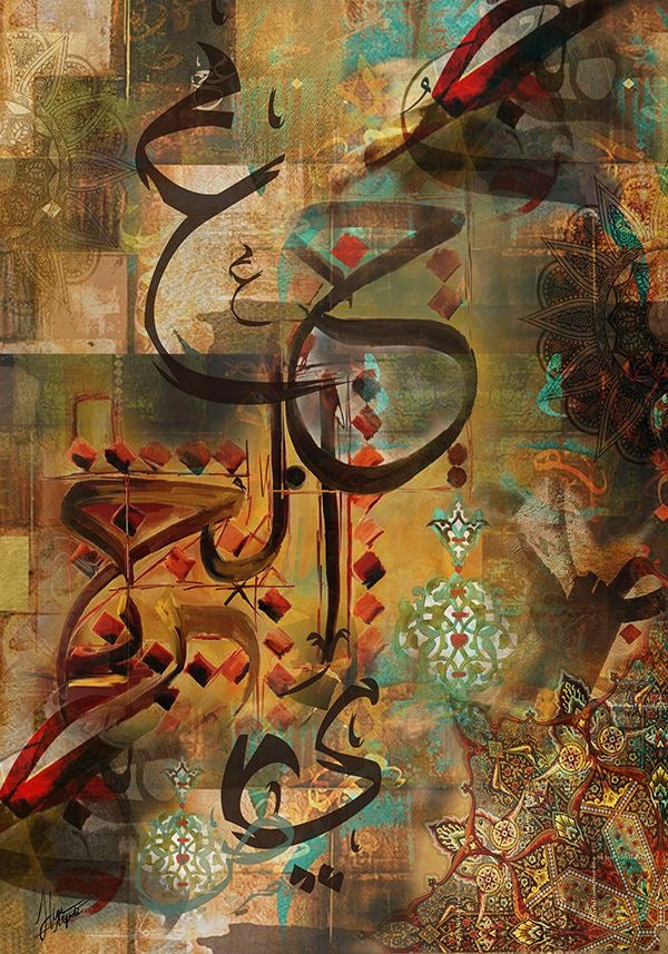 A rich abstract canvas artwork blending expressive Arabic calligraphy with layered textures and warm earthy tones. This artistic piece combines spirituality and contemporary design, making it an elegant statement for modern Islamic and artistic interiors.