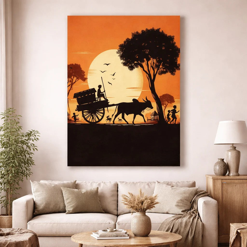 A warm artistic canvas featuring a rural village silhouette at sunset, with a bullock cart, children, and trees against a glowing orange sky. Rich in storytelling and nostalgia, this wall art brings cultural depth, warmth, and character to living rooms and modern interiors.