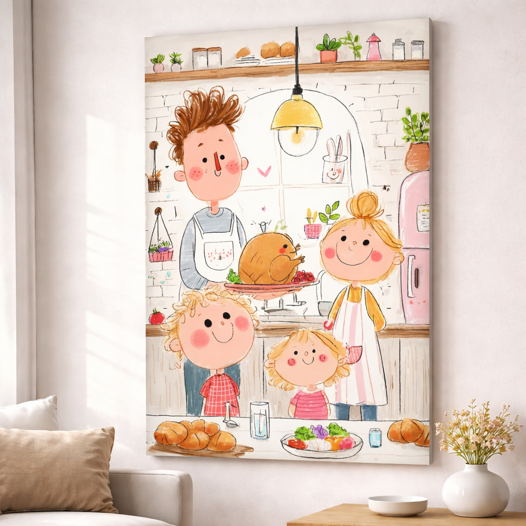 This charming illustrated canvas captures a joyful family moment in a cozy kitchen setting. Soft colors, playful characters, and warm details make it a perfect décor piece for kitchens, dining rooms, or family spaces.