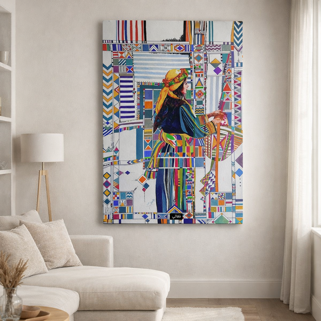 A bold contemporary canvas featuring a cultural female portrait framed by vibrant geometric patterns and rich colors. The layered composition and modern artistic style create a striking focal point, ideal for living rooms, offices, and sophisticated modern interiors.