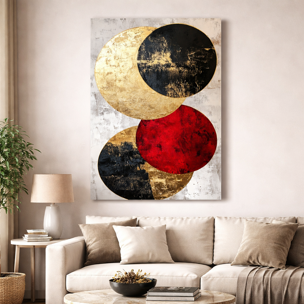 Modern abstract canvas featuring bold gold, black, and red circular forms. A luxurious statement artwork for contemporary interiors.