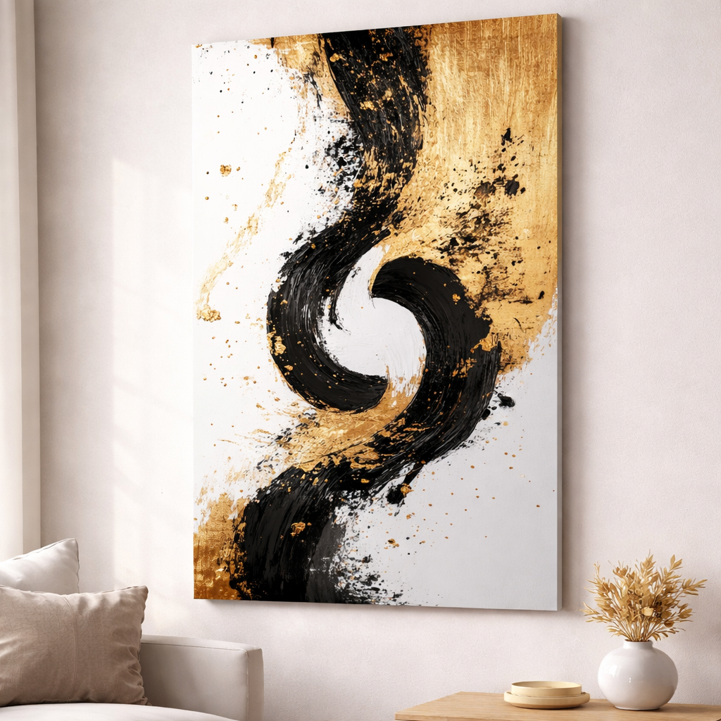 Modern abstract canvas featuring dynamic black brushstrokes with luxurious gold accents, perfect for contemporary interiors.