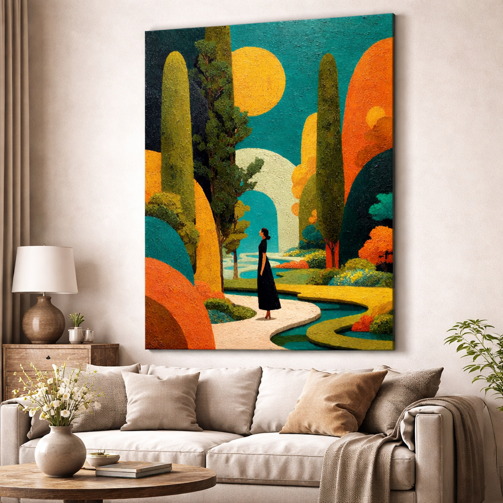 Surreal colorful landscape artwork on canvas featuring a peaceful garden scene.