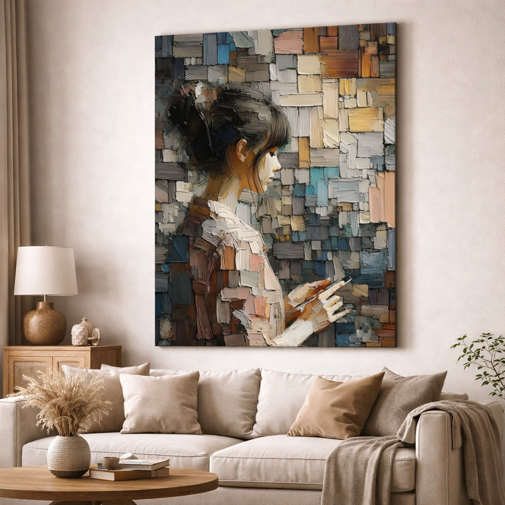 Artistic mosaic-style portrait printed on high-quality canvas with layered textures.