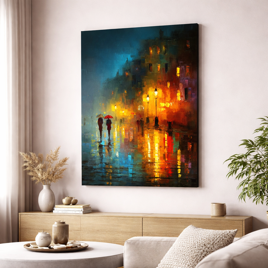 Moody rainy street night scene printed on premium canvas with reflective colors.
