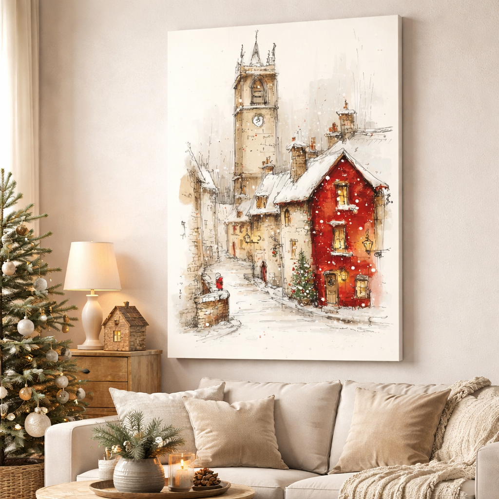 Cozy winter village scene featuring a red house and soft snowfall on premium canvas.