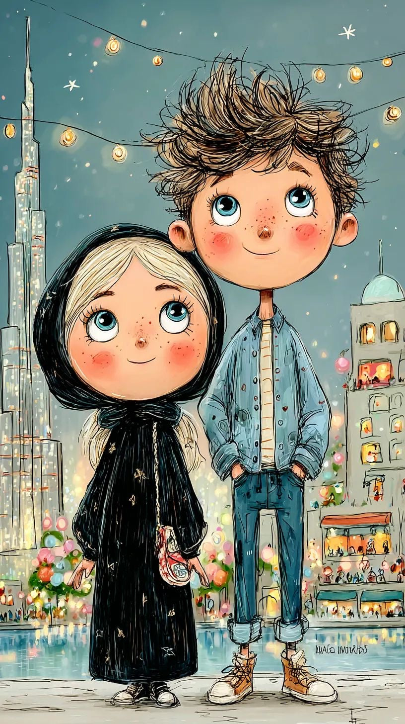 A sweet illustration of two kids standing together in a glowing city night, full of warmth and imagination.