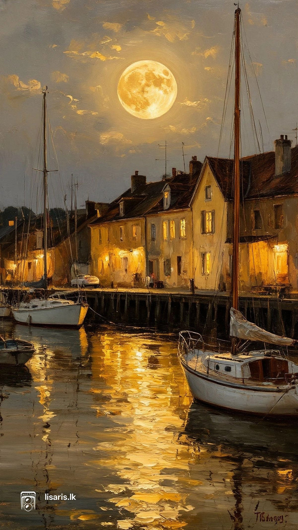 A romantic canvas wall art capturing a peaceful harbor village illuminated by warm lights under a glowing full moon. The reflections on the water and soft evening tones create a calm, dreamy atmosphere, perfect for living rooms, bedrooms, or elegant interiors. Printed on premium-quality canvas with rich colors and painterly detail.
