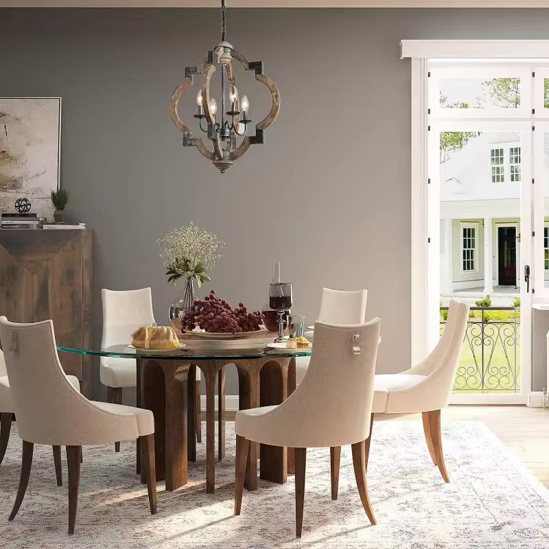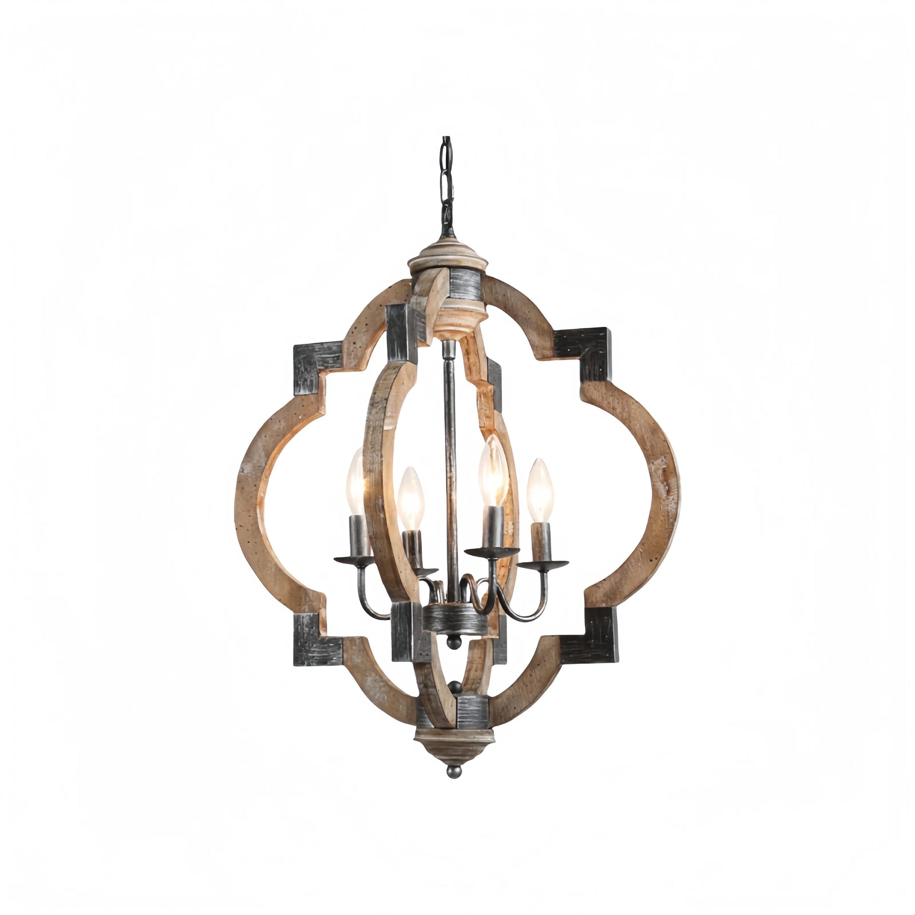 This rustic chandelier features a unique quatrefoil design with wood and metal accents, creating a vintage and elegant look for your home.