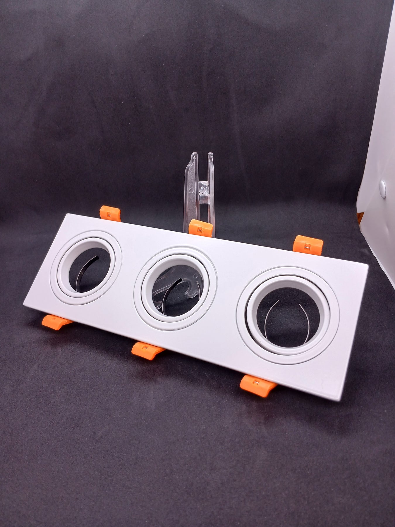 Modern triple recessed ceiling frame set available in black and white finishes. Perfect for LED spotlights, combining functionality with a sleek, minimalist design.
