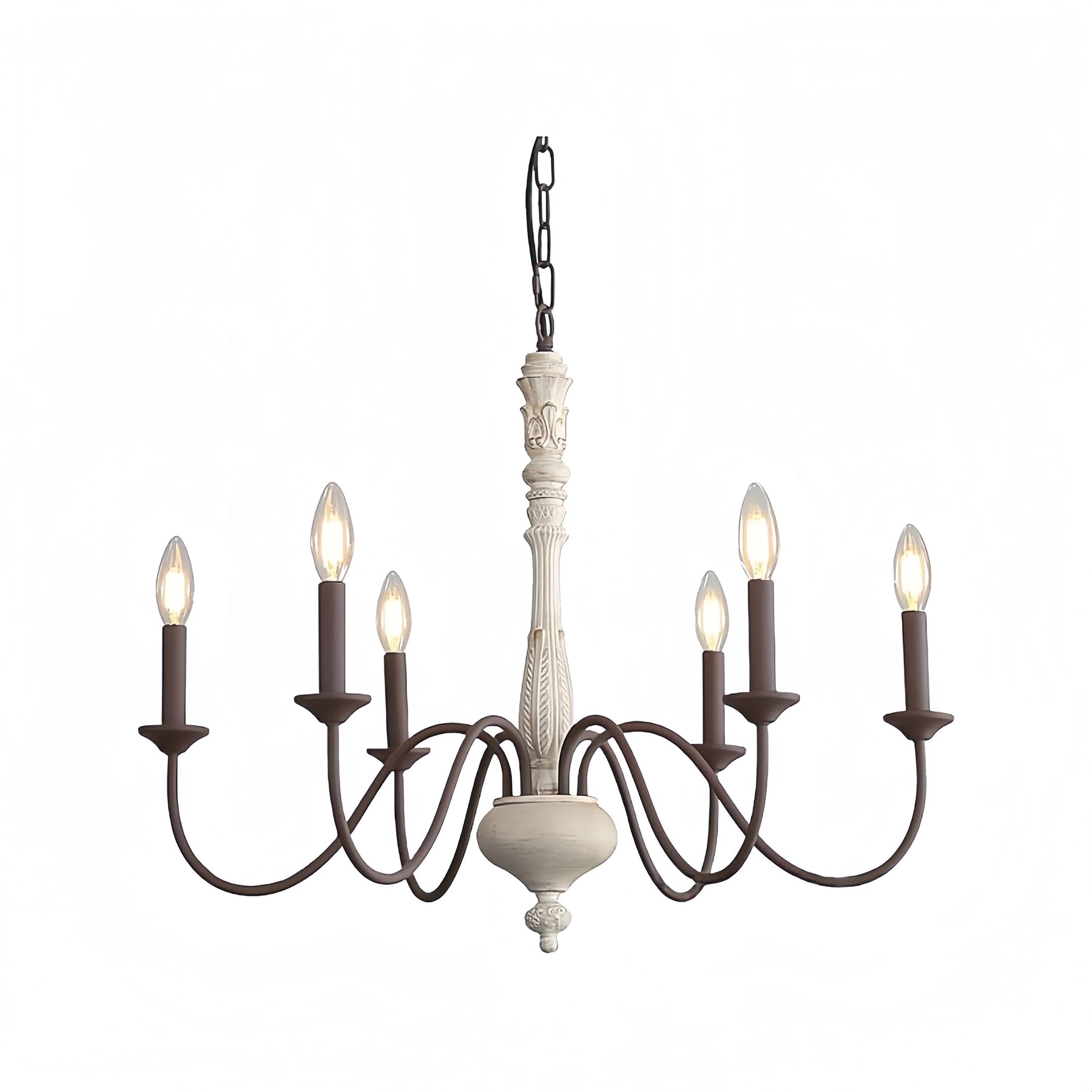 This elegant 6-light chandelier features a vintage-inspired design with a white finish and dark brown accents, perfect for adding a classic touch to traditional or rustic spaces.